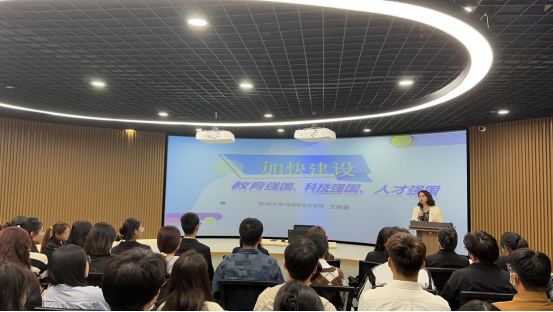 开班仪式后,苏州大学马克思主义学院王晓蕾老师作了题为“加快建设教育强国、科技强国、人才强国”的专题培训。她以C919大型客机的成功商业运行事例引入,向我们介绍了教育、科技、人才三者之间的辩证统一关系,以及在实现中华民族伟大复兴中的关键作用。只有教育、科技、人才三者协同发展,中国才能走向更加繁荣昌盛的未来。