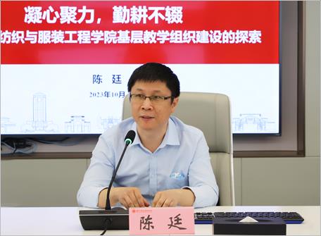 陈廷教授结合实例,分享了苏州大学纺织与服装工程学院基层教学组织建设方面的探索和经验。他从教学实施与评价、专业能力培养与提升、教学研究与质量保障等组织职能角度出发,以其主导的纺织品设计与工艺课程群教学团队建设为主线,介绍了团队从苏州大学课程思政教学团队起步,通过不断积累、打磨,逐步向校本科教学团队、校一流本科教学团队、江苏高校“青蓝工程”优秀教学团队跃进,以及获批教育部虚拟教研室的建设过程和主要举措。讲解内容细致、深入,对我院课程建设、青年教师培养及校企合作等方面有极强的指导和实践意义。