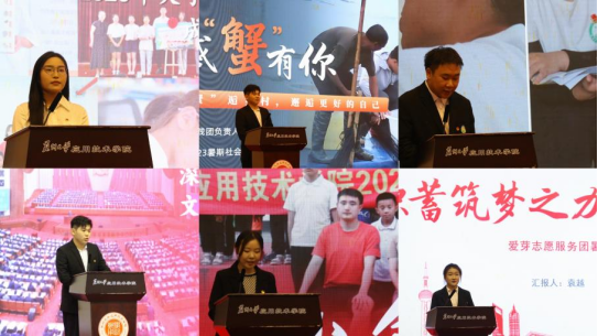 随后,六支优秀实践团队围绕前期策划、实践开展、成果展示、感悟分享进行汇报交流。“一苇益航”志愿服务团以“情与湖北柴湖共,乡村振兴青年为”为主题,致力于送课下乡、助农直播、文化振兴、调研献策、改善民生助力乡村发展;“小白杨”实践团以“情暖今盛夏,实践助振兴”为主题,致力乡村振兴、关爱留守儿童、直播助农,展现青年力量;“三元·筑”暑期社会实践团联合共青团启东市委员会,为当地儿童创建“七彩假日”趣味课堂,并帮助当地乡村农副产品打造全新包装设计;“爱芽”志愿服务团前往聋哑学校,以丰富特殊教育“康、医、教”一体的实施策略教导聋哑学生;“希冀繁星”青春志愿服务团以“研学拓视野,助农促振兴”为题,切实用所学知识振兴乡村;“感‘蟹’有你”实践团围绕蟹韵文化,走访蟹农了解当下大闸蟹产业的发展,探索乡村振兴产业新模式。