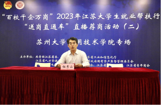 学院党委副书记、副院长钮秀山代表学院对莅临现场的来宾和观看直播的江苏各高校同学表示热烈的欢迎,对支持和参与本次活动的各家企业表示感谢。我院自1997年成立以来,始终秉承“学以致用”的院训,坚持培养具有创新思维、实践能力和职业素养的高层次应用型人才。截至目前,我院除了组织毕业生参加国家和省市级相关部门的网络招聘会,还分层次、分类别举办了多场线上线下招聘会、企业宣讲会,累计参会用人单位120家,提供岗位需求4000个。他指出,大学生是宝贵的人力资源,我院会进一步加强就业指导服务,继续高度重视大学生就业,持续关注未就业学生动态,密切关注专业人才缺口,不断优化毕业生就业环境,为毕业生精准就业保驾护航,为“稳就业”“保就业”工作大局贡献力量。