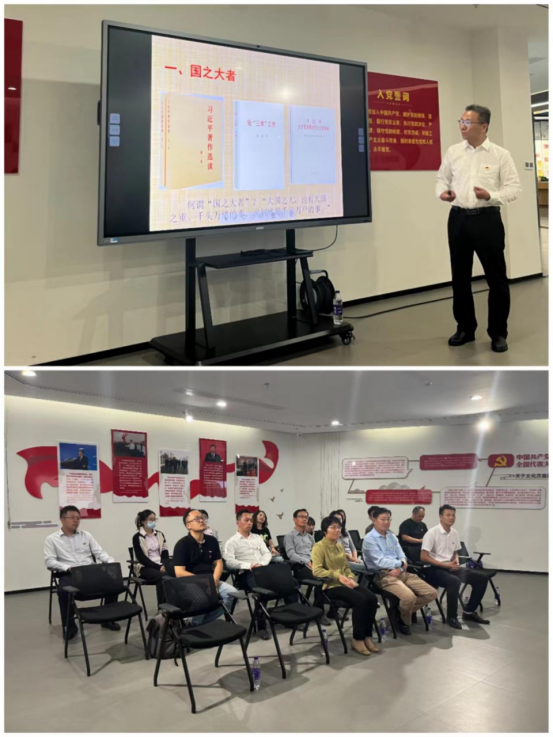 在党员教育专题馆内,苏州市农业农村局刘庆安同志为全体党员开展了题为《浅谈文化强国与文化自信——以农耕文化为例》的专题党课,他从习近平总书记的家国情怀和系列论述引入,从国之大者、诸子百家、农耕文化、诗书抒怀四个方面,概括梳理先秦以来主要学派和名家点评,探寻我们的文化从哪儿来;从农耕文化的历史脉络和鱼米之乡的苏州实践谈起,感悟中华传统文化的源远流长、博大精深,激发我们的文化自信和自强基因;引领倡导古韵新风,践行守正创新,推动古为今用,赓续传承中华文化,让她在新时代焕发出新的蓬勃生命力,用中华文明浸润我们的心灵,给我们留下一片精神的绿洲。