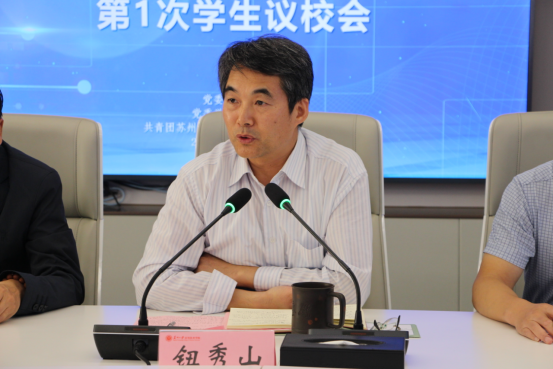 为落实以“学生为中心”的工作理念,激发广大同学民主参与校园管理的热情,10月30日下午,苏州大学应用技术学院第一次学生议校会在图书馆西512会议室举行。学院党委副书记、副院长钮秀山,校务部、教学科研部、招生就业处、后勤与资产处、信息化建设与管理中心等部门负责人以及各二级学院党总支书记出席会议,参加会议的还有学生会委员会、学生会、二级学院学生分会、议题提案人共29名学生代表。会议由团委书记严永伟主持。
