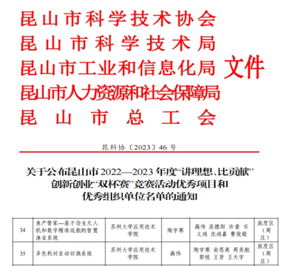 近日,昆山市2022-2023年度“讲理想、比贡献”创新创业“双杯赛”竞赛活动优秀项目公布,我院推荐的2个学生项目成功入围,并分别获得2000元资助。