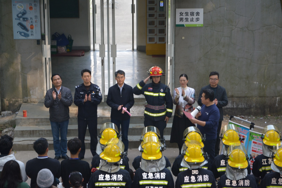 学院党委副书记、副院长钮秀山担任本次演练总指挥,学生事务部部长、学生工作处处长查伟大,保卫处处长金红祥,昆山市公安局周庄派出所副所长李洪雪,昆山市消防救援大队周庄消防中队副中队长阮忠诚,消防中队指战员,以及大学生安全管理中心工作人员、物业宿舍管理员、物业保安和师生代表300余人参加了此次演练。