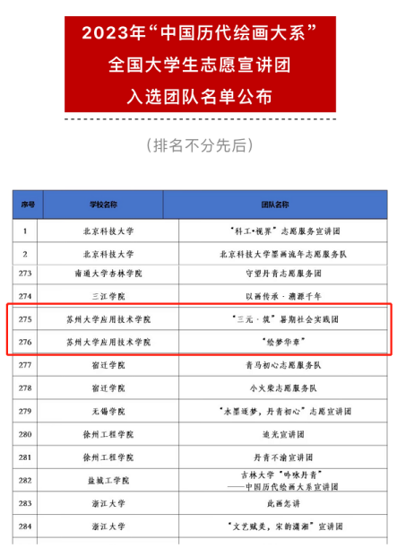 为深入贯彻落实习近平文化思想,推动中华优秀传统文化的传承发展和国际交流,团中央青年志愿者行动指导中心、教育部中外语言交流合作中心、中国外文局文化传播中心、浙江大学、中国文物报联合发布了《关于遴选2023年“中国历代绘画大系”全国大学生志愿宣讲团的公告》,活动得到了各高校志愿服务团队的广泛关注和积极参与,来自山东大学等379所高校的1000支大学生志愿服务团队入选。经过材料报送,主办单位评审等环节,我院周庄文化旅游学院“三元·筑”志愿服务宣讲团、工学院“绘梦华章”志愿服务宣讲团成功入选2023年“中国历代绘画大系”全国大学生志愿宣讲团。