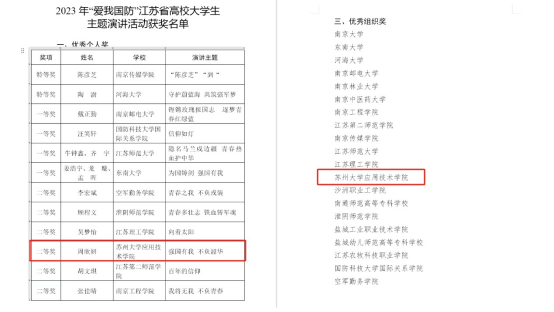 近日,2023年“爱我国防”江苏省高校大学生主题演讲活动在南京落下帷幕,我院周庄文化旅游学院2023级本科生周欣妍荣获优秀个人奖二等奖,学院获优秀组织奖。