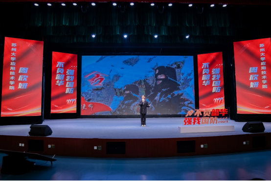 自备赛以来,学院高度重视,精心组织院级比赛选拔优秀选手。活动当天,院人武部老师、指导老师现场观摩比赛。参赛选手周欣妍通过讲述军人的典型感人事迹,表达了当代大学生“强国有我,不负韶华”的爱国之情,展现了苏大应用学子积极向上的精神风貌,是我院扎实开展国防教育工作的又一成果。