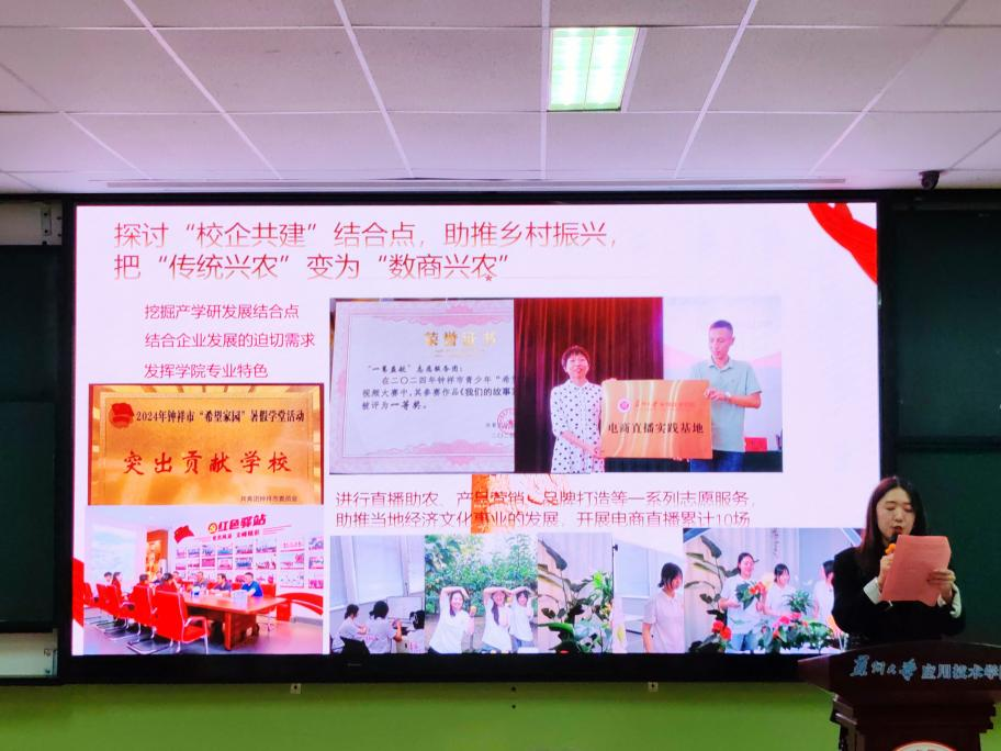 随后,各二级学院依次就2024年暑期“三下乡”社会实践工作进行汇报交流。商学院以“青春为中国式现代化挺膺担当”为主题,组织开展2024年暑期社会实践,教育引导广大青年学生在社会实践中厚植家国情怀、了解国情民情、增长知识才干、激发英勇担当;周庄文旅学院聚焦坚持为党育人、为国育才,联动校园内外,助力广大青年学生上好与现实相结合的“大思政课”;工学院立足专业建设,推动学生将理论知识与实践相结合,推动暑期社会实践工作走深走实。