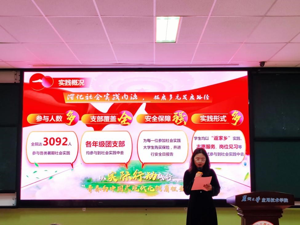 首先,学院团委书记严永伟介绍了我院2024年暑期社会实践活动的整体开展情况。他从“前期准备、制度保障、新闻宣传、工作成效、成果转化”五个方面介绍了我院2024年暑期社会实践工作开展情况。他表示,团委将继续团结引领广大团员和青年深入学习贯彻党的二十大精神和党的二十届三中全会精神,认真贯彻习近平总书记关于青年工作重要论述,引导和帮助广大团员和青年增强历史责任感和使命感,激发强国有我的青春激情,把小我融入祖国的大我、人民的大我之中,紧紧围绕新时代新征程学院党委的中心任务,立足岗位、苦练本领、创先争优,努力成为学习榜样、青年先锋,在担当中历练,在尽责中成长,为学院各项事业高质量发展贡献青春力量。