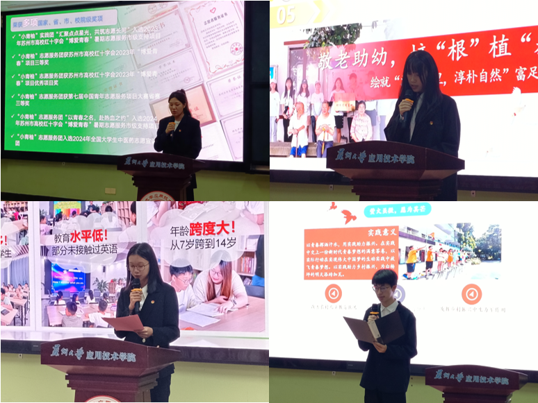 接着,四支优秀实践团队围绕前期策划、实践开展、成果展示、感悟分享进行汇报交流。“小青柚”青年志愿者协会“小青柚”红十字志愿服务团鼓励青年志愿者主动投身于志愿服务事业,并努力拓展服务内容与渠道,以树立我院志愿者协会的良好形象;商学院“青葵”实践团前往江苏徐州邳州市,用教育的力量为当地孩子们点亮希望,拓宽视野;工学院“小白杨”实践团致力乡村振兴、改善农村教育情况、关爱留守儿童、直播助农,展现我院的青年力量;周庄文旅学院“希冀繁星”青春志愿服务团以“农教双融递‘心’声,基层共建汇‘新’力”为题,传承非遗守护文化,助力乡村振兴。