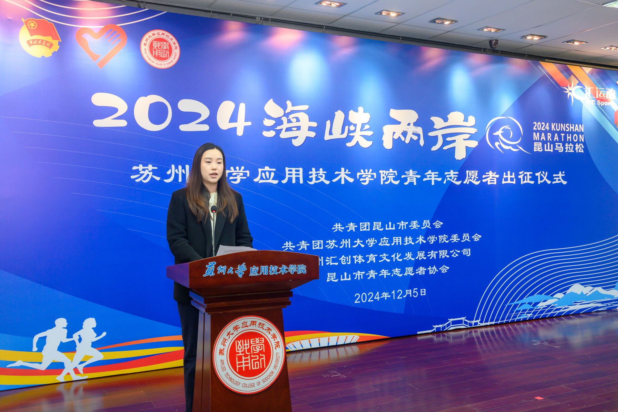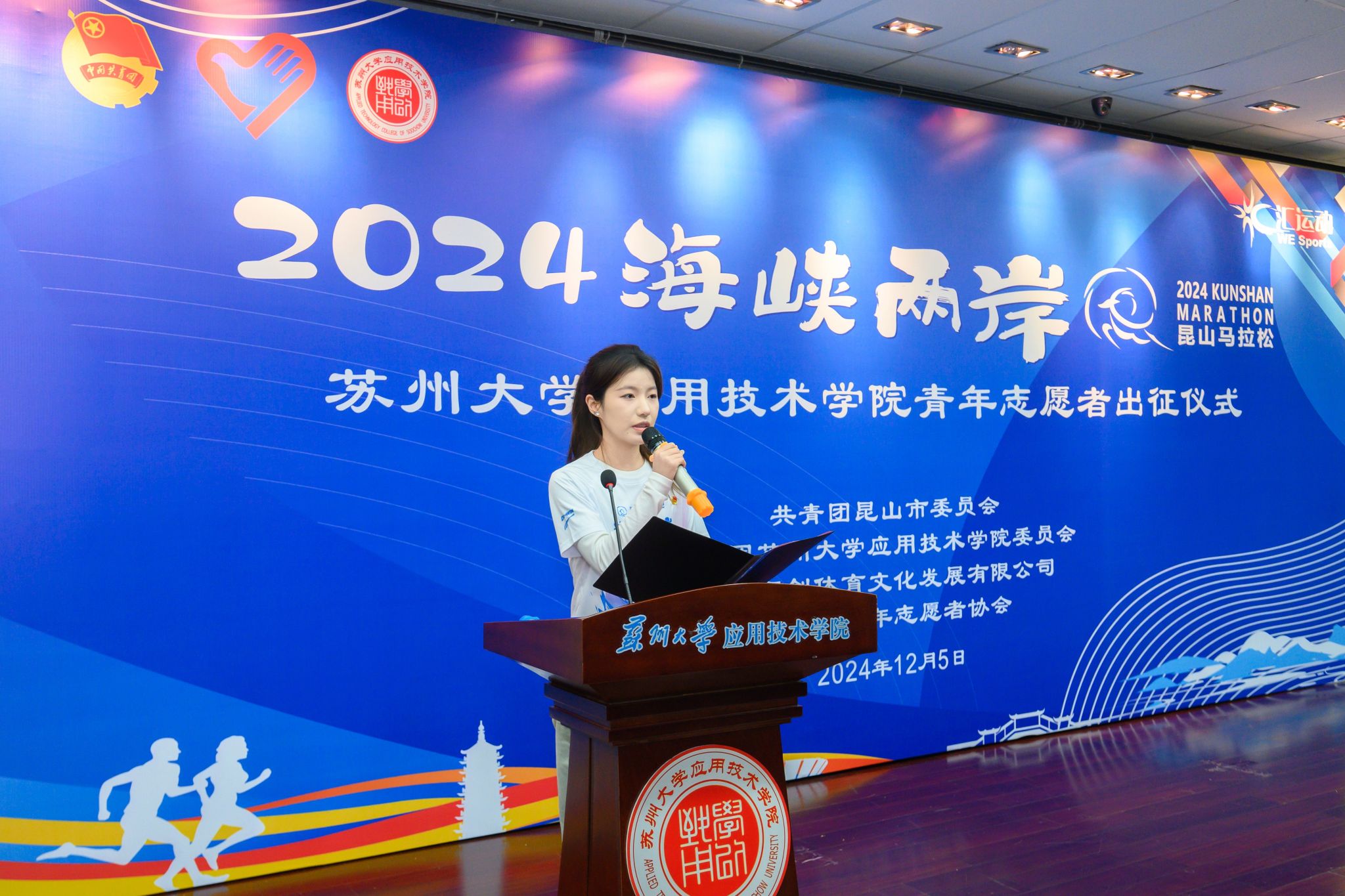季吉祥同学代表我院1400余名志愿者发言,她表达了对即将承担的2024年海峡两岸(昆山)马拉松志愿服务工作的期待和决心。她表示,海峡两岸(昆山)马拉松不仅是一场马拉松爱好者的体育赛事,更是两岸文化交融凝聚的纽带,能够参与本次赛事的志愿服务工作,全体苏应青年志愿者深感责任重大、使命光荣,在接下来的工作中,全体志愿者将发扬“奉献、友爱、互助、进步”的志愿服务精神,秉持“专业、热情、细致、周到”的服务原则,全力以赴做好每一项工作,为参赛者提供精准、高效的服务。