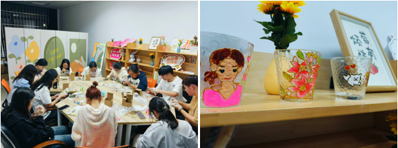 “透明调色板上的斑斓”彩绘玻璃杯活动,让色彩与玻璃杯碰撞出艺术火花。参与者静心创作,将情绪融入涂鸦,无意识通过色彩和线条被看见和表达,实现了自我意识的整合,不仅创造了独一无二的作品,更是一次深刻的心灵治愈和自我发现之旅。