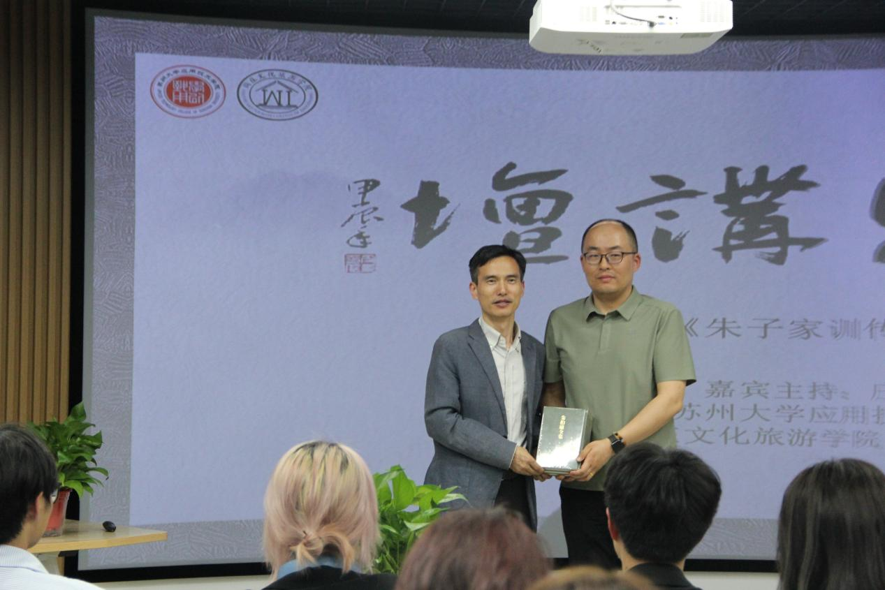 最后,居永良向我院赠送了《朱柏庐全集》,周庄文旅学院党总支书记、副院长燕君上台接受赠予,并且合影留念。