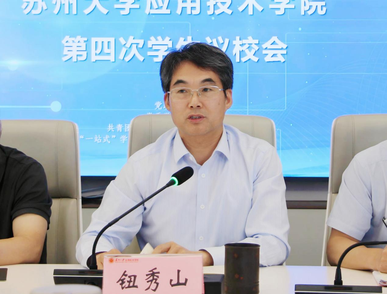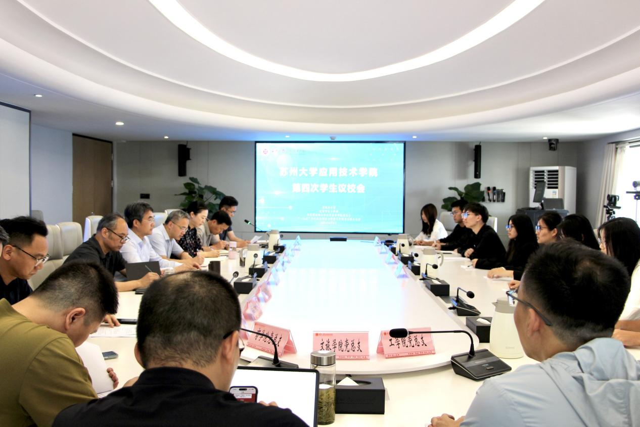 6月6日下午,苏州大学应用技术学院第四次学生议校会在图书馆西512会议室顺利举办。学院党委副书记、副院长钮秀山,党政办公室、教学科研部、学生事务部、质量与评估处、后勤资产处、信息化建设与管理中心等职能部门主要负责人,各二级学院党总支书记、团总支书记、学生分会指导老师以及学院学生会委员会、学生会、二级学院学生分会等工作人员、议题提案人等学生代表共同参会。本次会议由团委书记严永伟主持。