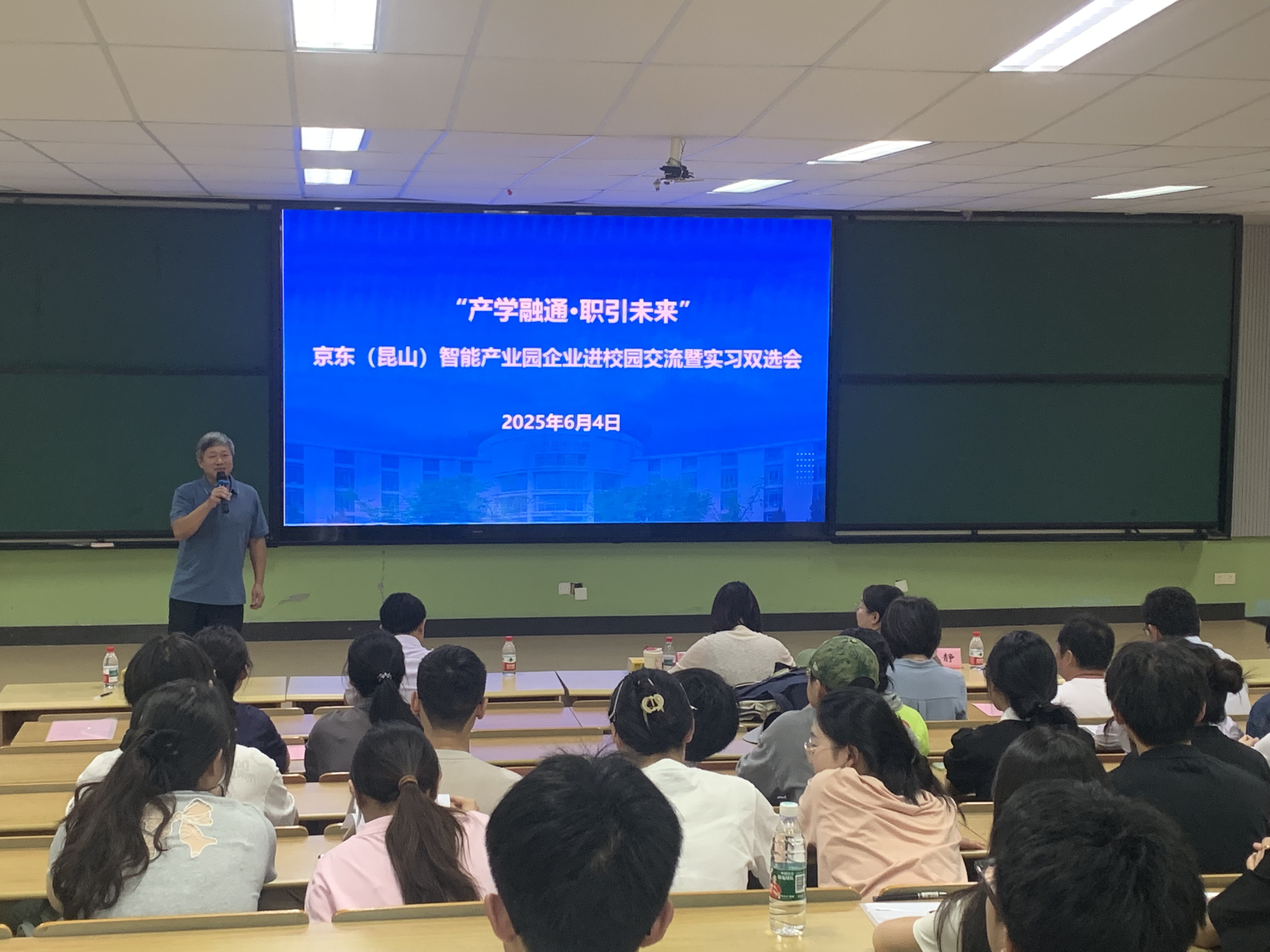 为深化产教融合,搭建校企合作桥梁,助力在校学生精准对接行业需求,6月4日下午,“产学融通·职引未来”京东(昆山)智能产业园企业进校园交流暨实习双选会在孚新楼101隆重举行。此次活动由昆山花桥经济开发区党群工作部、京东(昆山)智能产业园与我院联合举办,花桥经济开发区党群工作部人才开发与管理科科长曹丽花,京东(昆山)智能产业园运营总监李静,学院京东(昆山)智能产业学院副院长陈再良、李东亚,14家园区企业代表及教师代表出席,现场吸引300余名学生参与。