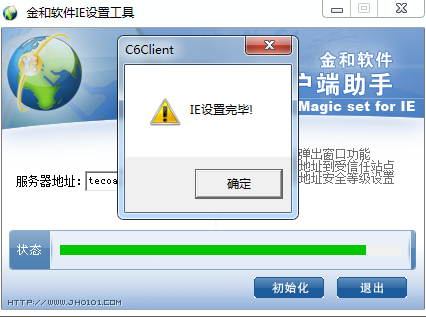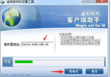 2.第一次使用OA需要先初始化浏览器,建议使用OA初始化工具,可以从QQ群“苏大应用工作交流群”里面下载,运行后会要求输入OA的服务器地址,服务器地址为:tecoa.suda.edu.cn ,点击“初始化”,如果出现”IE设置完毕“,说明设置成功!不成功的话可以重复试几次。如下图: