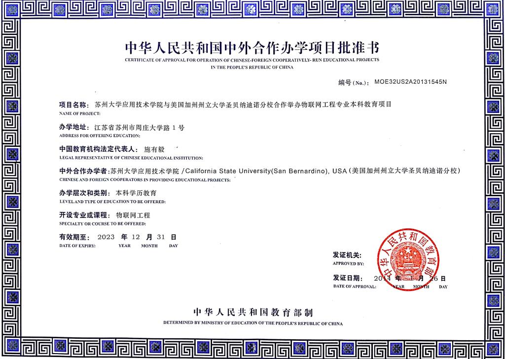 我院物联网工程(中外合作办学)专业是2014年获国家教育部审批通过的中外合作办学项目(批准书编号为:MOE32US2A20131545N,专业代码为:080905H)。
